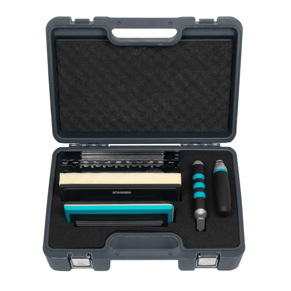 Набор состоит из пяти зубчатых лезвий из нержавеющей стали разной формы, трех шпателей разной твердости для работы с затирками как цементной, так и эбоксидной и губки для выполнения работ по очистке. Зубчатые лезвия имеют размер: длинна 280мм, ширина 115мм и толщина 0,7мм. Рабочая пластина гребёнок изготавливается из высокоустойчивой к истиранию нержавеющей стали. Одна из особенностей всех гребёнок BIHUI - идеально ровная и гладкая поверхность рабочей пластины. Другой отличительной чертой набора является широкий ассортимент съемных лезвий (шпателей) и размеров зубцов.