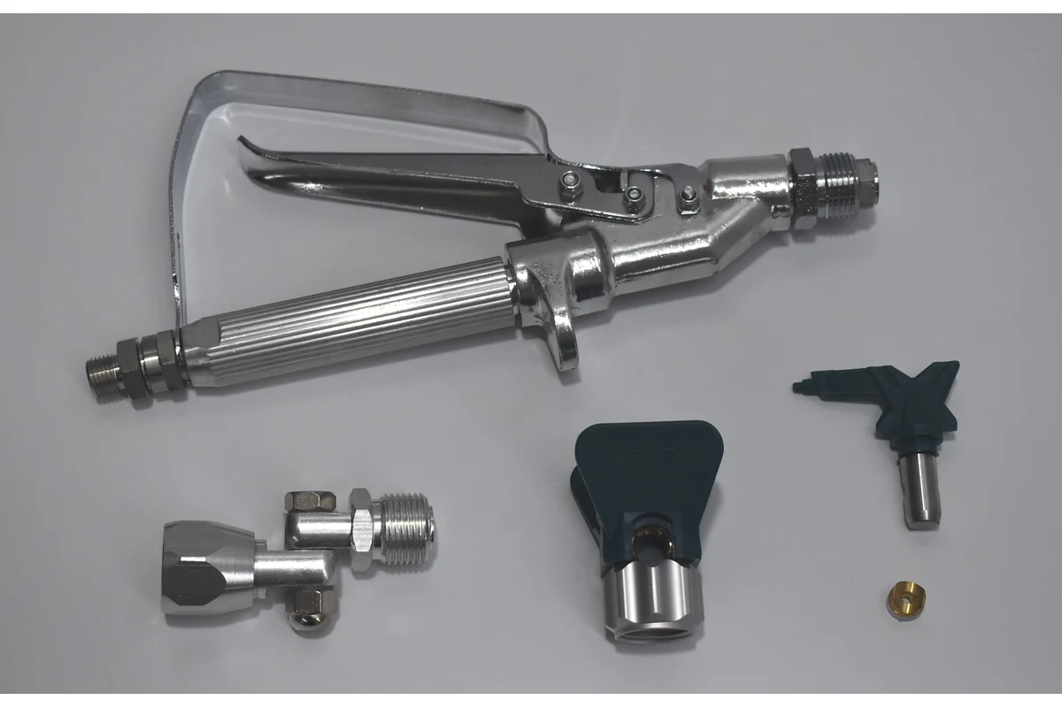 - Специальная конструкция пистолета позволяет не выкручивая кисть руки красить потолки, а поворотный механизм и удлинитель необходимой длины позволят окрашивать труднодоступные места без применения стремянок и строительных лесов.