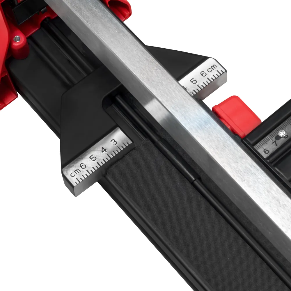 В комплект входят «П-образная» боковая отцентрованная линейка-упор, которая позволяют выставить плитку без дополнительной разметки, регулируя ровность реза. Линейка предназначена для серийной резки узких полос, а также для диагональной резки т. к. оснащена боковым упором для серийной резки и фиксации заготовок под углом 45º.
