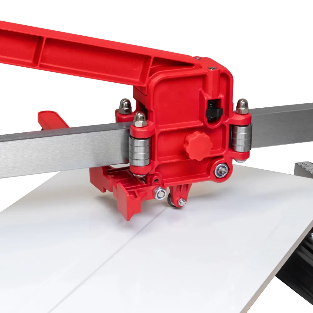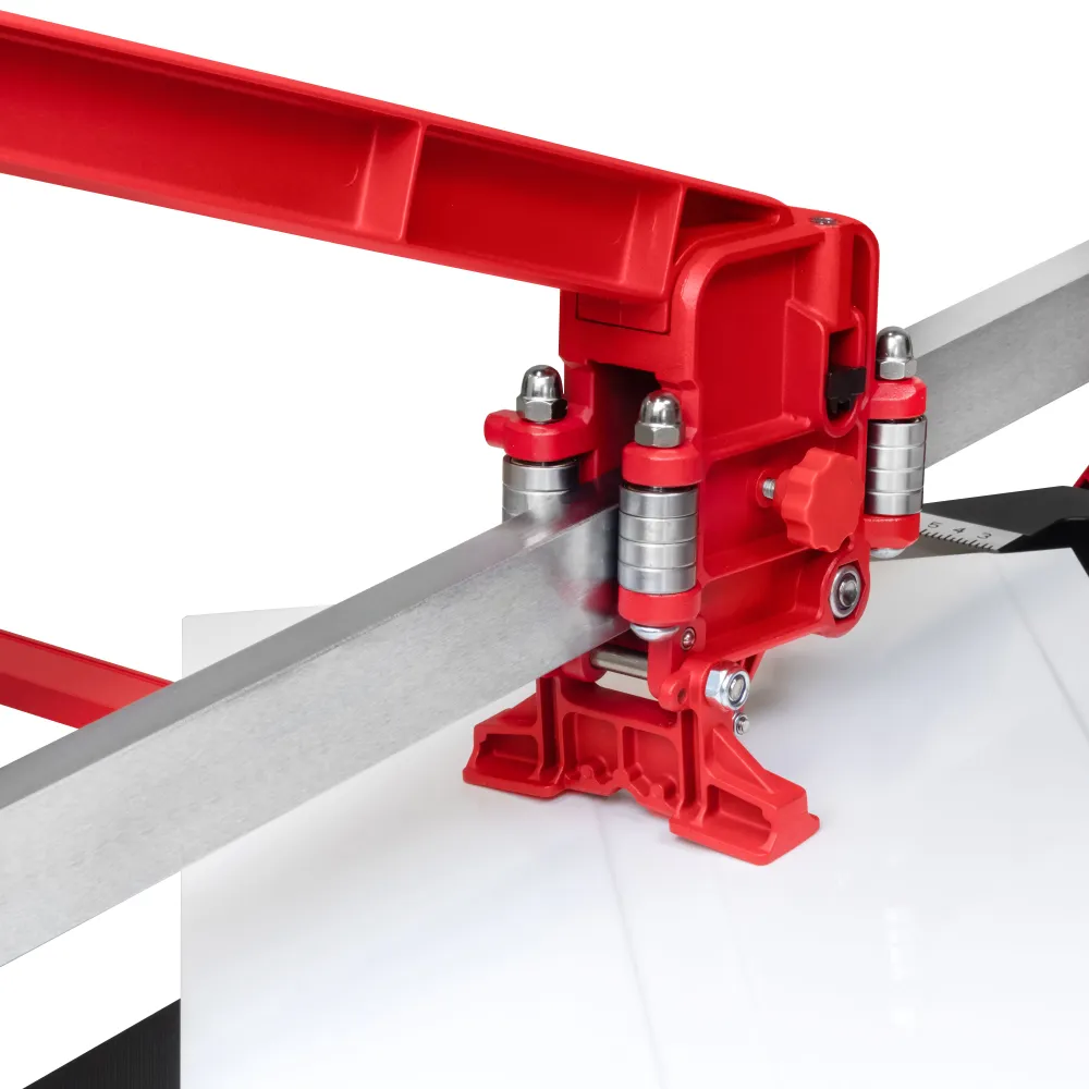 Устройство направляющей каретки плиткореза охватывает монорельс с четырех сторон и передвигается посредством механизма, который состоит из подшипников, что обеспечивает плавность хода.