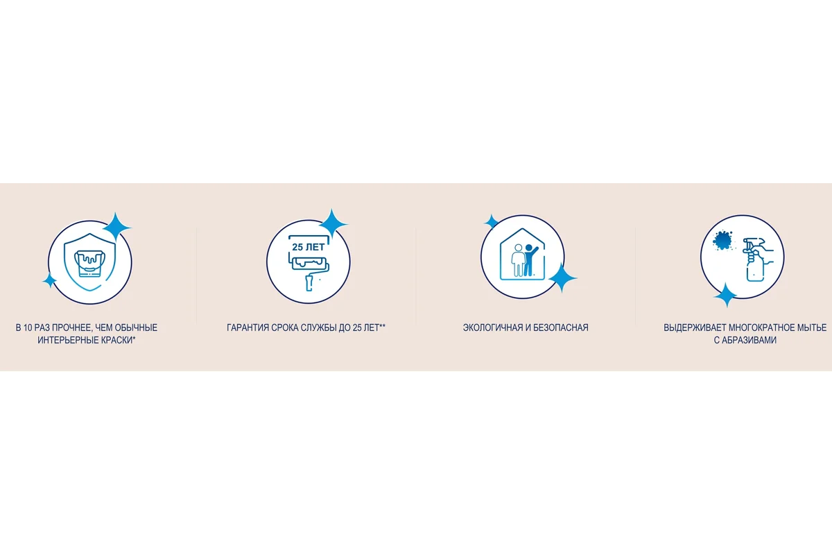 Водно-дисперсионная краска на акриловой основе. Применяется только внутри помещений. Подходит для окраски бетонных, кирпичных, оштукатуренных стен, потолков. Можно работать по гипсокартону, ДВП, обоям, предназначенным под окраску. Образует абсолютно ровное и гладкое глубоко-матовое покрытие, стойкое к износу.