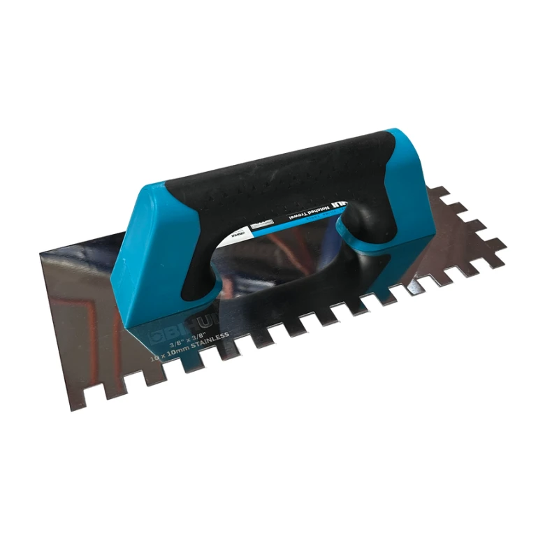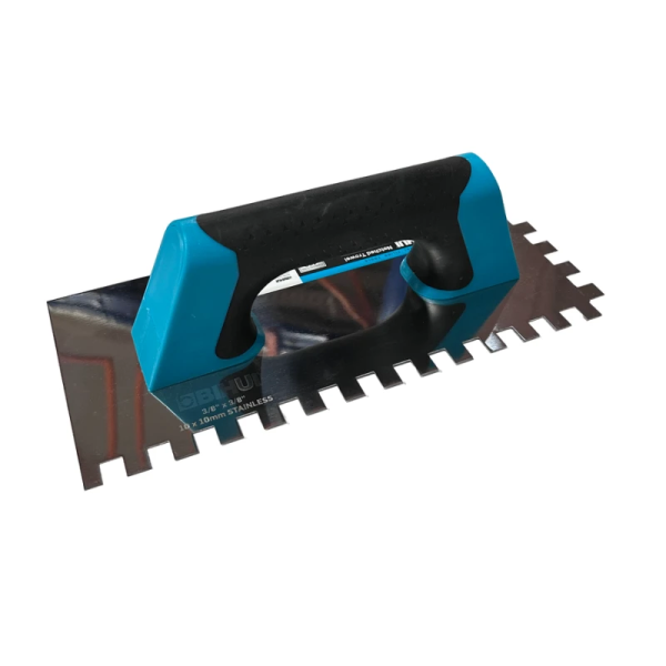Эргономичная закрытая рукоять с нескользящим покрытием имеет удобный захват, такой профиль ручки предотвращает попадание плиточного клея и строительной грязи внутрь, а рука не соскальзывает, и крепится к лезвию с помощью заклепок, а зеркально отполированная рабочая часть снижает риск прилипания материала к полотну и обеспечивает гладкое покрытие без неровностей.